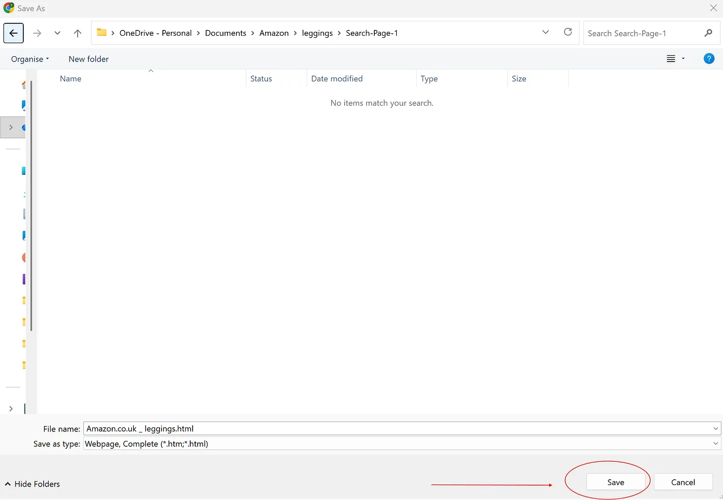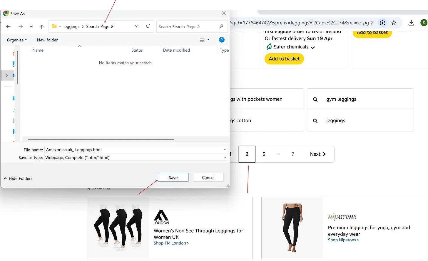 On the Amazon search-results page, press Ctrl+S and save the page as a complete webpage inside Search-Page-1. Wait until the save fully finishes.